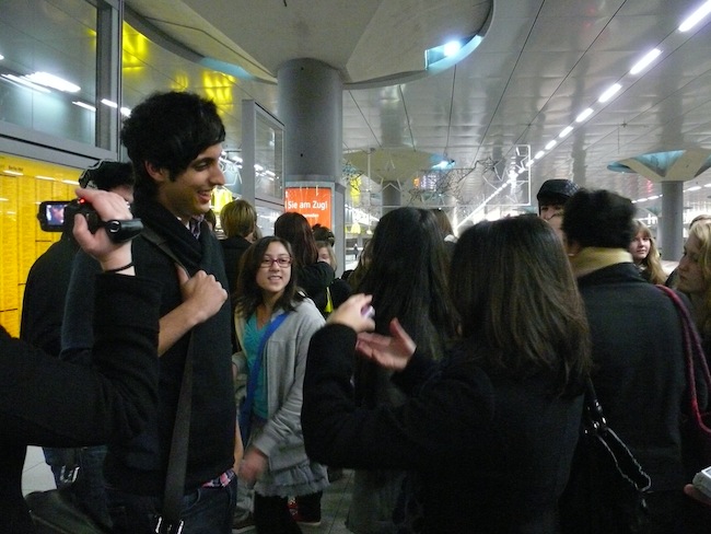 Lange vor dem angekündigten Zuschauertreffen warten bereits die ersten Teenie-Grüppchen vor dem goldenen M in der kahlen Zwischenetage des Berliner Hauptbahnhofs. Die Stimmung ist entspannt, die Zuschauer treffen auf bekannte Gesichert: Das Youtube-Treffen ist vorallem ein Austausch der Fans untereinander. Fleißig werden Emailadressen und Youtube-Nicks auf Zettel geschrieben und dem reell gegenüberstehenden Gesicht zugeordnet. Zwischendurch die Nachricht über Twitter, dass die angekündigten Youtuber noch im Stau stecken: Der Verkehr ist am Freitag Nachmittag sehr zäh..