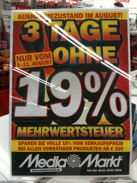 Neue Marketing-Runde bei MediaMarkt: 3 Tage lang gibt es auf alle Produkte 19% Rabatt. Bericht vom Apple-Kauf.