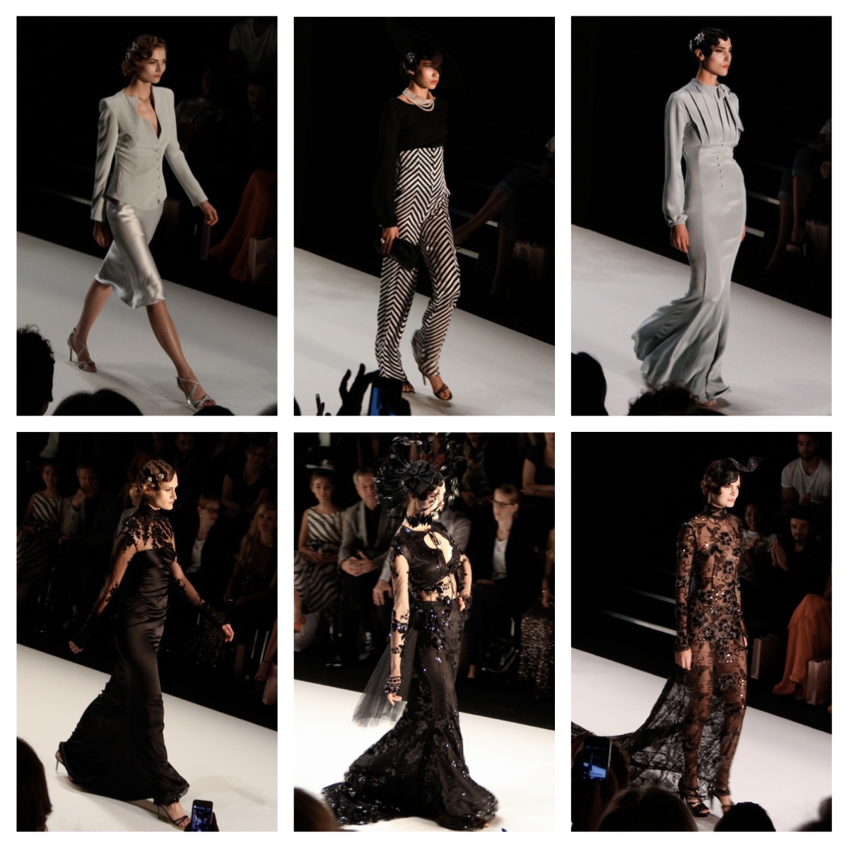 Die Kollektion bestand größtenteils aus edler Abendrobe in schlichtgehaltenen schwarz/weiß Tönen, verziert mit Spitze und Transparenz. Passend dazu: XXL-Hüte als Accessoire.